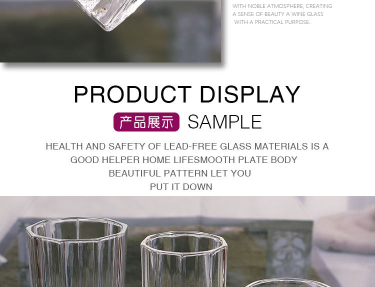 公司产品包括高脚杯,水杯,烈酒杯,威士忌杯,啤酒杯,花瓶, 果盘,水壶,烛台,醒酒器等各类人工、机制产品,及烤花、喷漆、电镀、打砂、刻花、等各种后加工。产品均通过了SGS,FDA,BV和LFGB测试,在使用上完全能够保证安全性与实用性。工厂已通过SEDEX 验厂,并且获得了欧洲大部分客户的认同。该验厂从人权,员工福利,生产质量流程都有严格的标准,而我司好的验厂结果,无疑笃定了瑞信在整个玻璃深加工的龙头企业的地位。